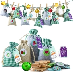 24 Stoffsäckchen zum Befüllen und Aufhängen in den Farben grün und grau.